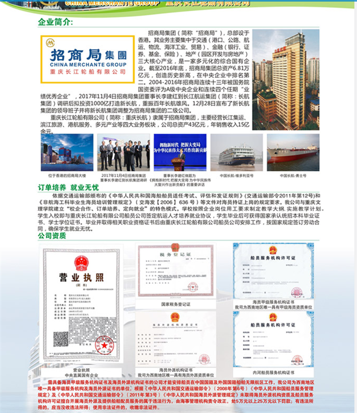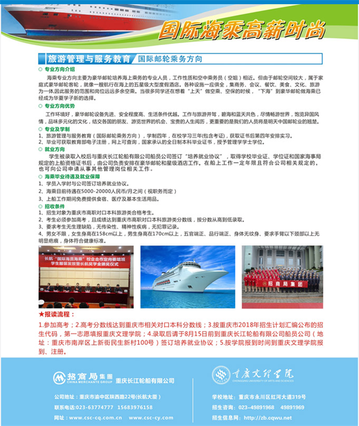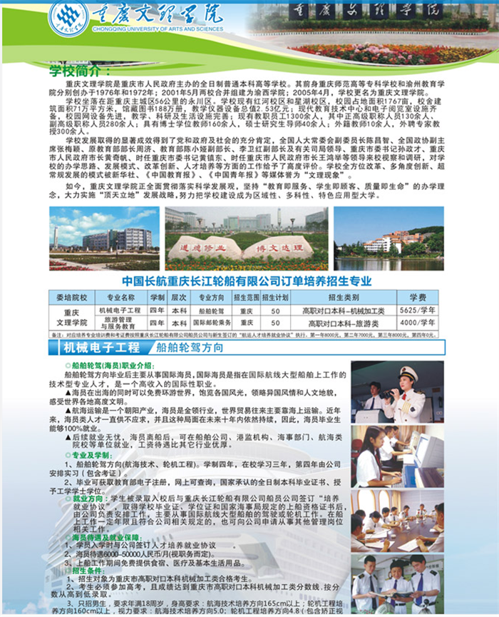 重庆文理学院与重庆长江轮船公司校企合作2018年招生简章